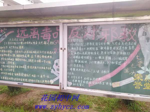 随着一年一度禁毒日的来临,花园初中为切实增强青少年学生自觉远离毒品的意识和抵制毒品的能力,确保校园无毒品、学生不吸毒,配合陈瑶湖镇政府、派出所在全校范围内开展了禁毒宣传教育活动,通过主题班会、板报和发放《致家长一封信》等形式对广大大学生开展禁毒宣传教育。