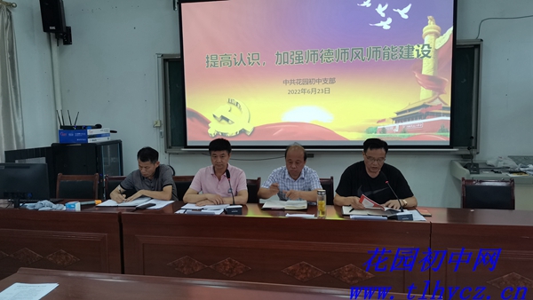 6月23日下午,中共花园初中支部在四楼会议室召开“提高认识,加强师德师风师能建设”主题大会,会议由支部书记余国胜同志主持,花园初中校长朱红春及全体党员出席了会议。