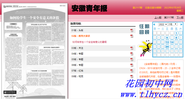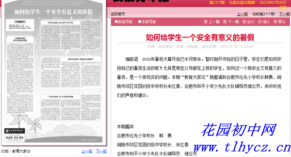 专版报道从“正确看待暑假,科学衔接张弛有度”、“守牢安全底线,线上线下共护平安”、 “做好科学规划,劳逸结合全面提升”、“广纳社会资源,合力打造多彩假期”四个方面详细介绍了铜陵市郊区花园初中等学校落实“五育并举”、立德树人根本任务,努力促使“学期+假期”加法效应,巩固提升学校教育效果,避免产生“学期-假期”减法效应,弱化、抵消学校教育效果,广纳社会资源,合力打造学生多彩假期的措施和建议。