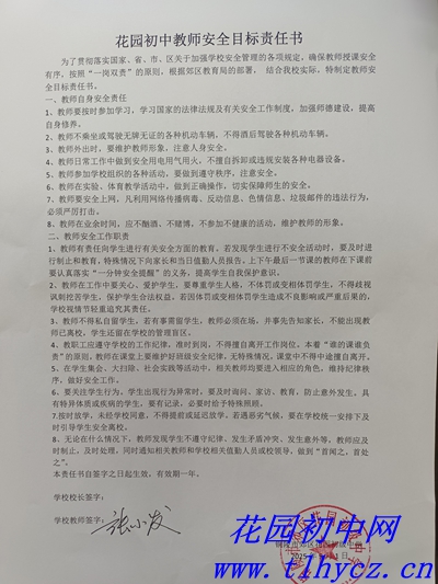 为强化安全责任意识,学校组织全体教师签订了《花园初中教师安全目标责任书》。责任书明确了各岗位安全职责和要求,建立了"层层负责、人人有责、各负其责"的安全工作体系,为校园安全提供了制度保障。
