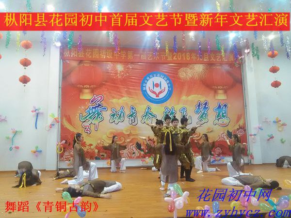 演出在铜陵市中职中心的大型歌舞《青铜古韵》中推向了高潮。这个获得省级大奖的节目,以浑然厚重的诗、乐、舞三位一体的表现形式,艺术地再现了辉煌灿烂的青铜文明,把观众导入时间隧道,去探访铜都古今博大精深的社会生活。整个节目以气势恢弘的舞动场面、绚丽夺目的场景渲染、清晰宏亮的专业音响,配以详实而精彩的现场解说,恢宏、精彩、空前的一场青铜文化艺术盛宴在花园初中上演,展示出富有特色的民族歌舞和铜陵悠久的青铜文化,颂歌唱响美妙的强音,和谐谱写绝伦的篇章。