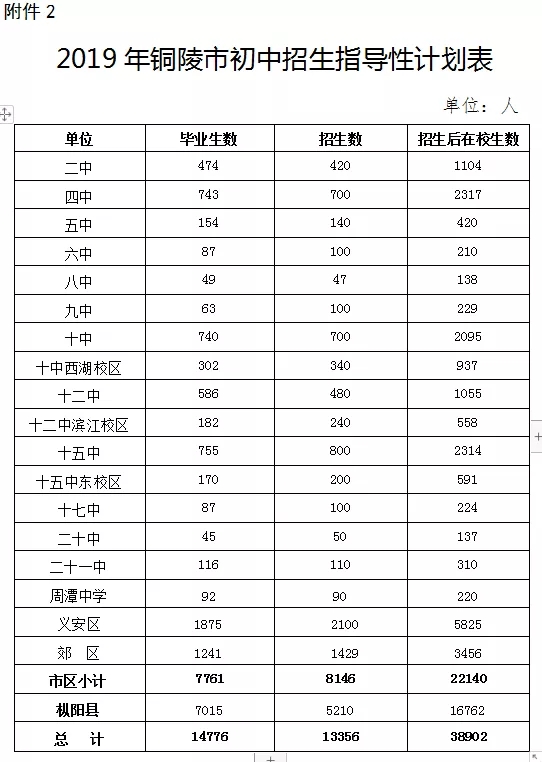 2.2019年铜陵市初中招生指导性计划表