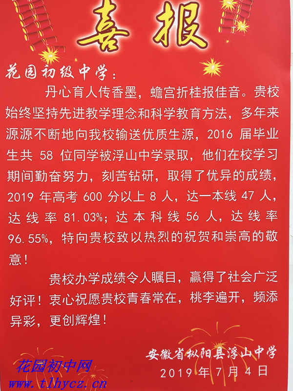 安徽省枞阳县浮山中学向花园初中发来高考喜报!
