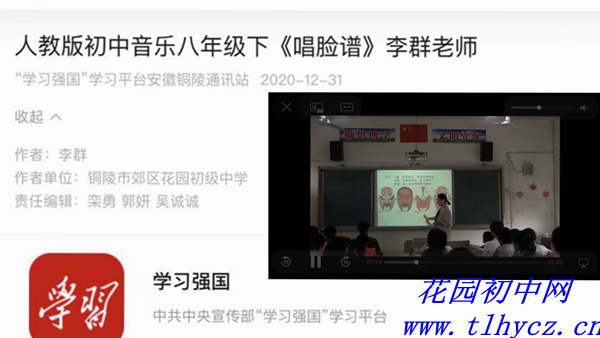 郊区花园初中李群老师的音乐课视频《唱脸谱》(人教版初中音乐八年级下)于12月31日登上“学习强国”学习平台。