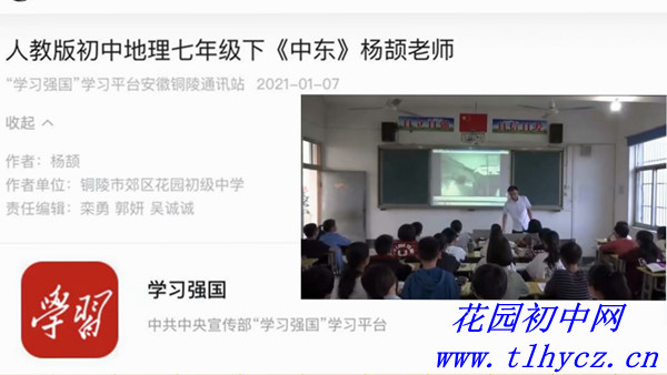 杨颉老师的地理课视频《中东》(人教版初中地理七年级下)于1月7日登上“学习强国”学习平台。