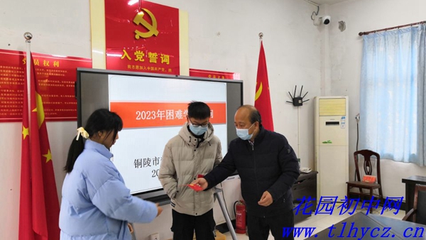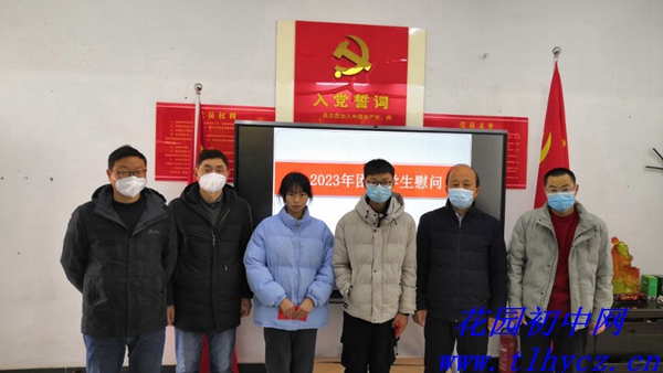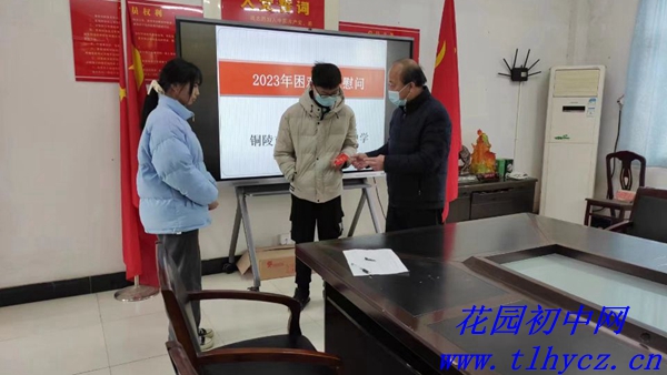 1月5日上午,受铜陵市关工委领导的委托,郊区花园初中党支部书记、校长朱红春等一行慰问了贫困学生纪皓天(904)和左丽丽(909),并转赠了慰问金。学校工会主席、关工委主任周平和两位班主任陪同参加了慰问。