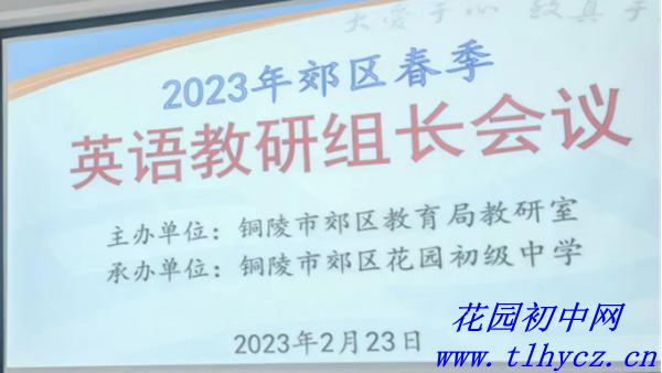 2月23日,郊区初中英语教研组长会议在花园初中举行。区教研室主任朱舒陵、花园初中朱红春校长、谢贵恒副校长与来自全区八所初中的英语教研组长及花园初中全体英语教师参加了会议。会议由区教研室英语教研员林清平校长主持。