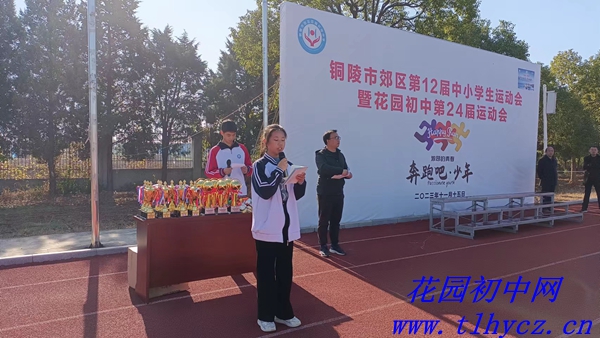 班级积分第一706班学生代表王玉洁和优秀运动员905班汪意安学生代表讲话。
