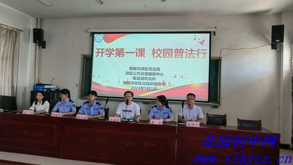 9月5日,郊区花园初中邀请铜陵市郊区司法局、郊区公共法律服务中心和陈瑶湖司法所为七年级部分新生上了一堂别开生面的“开学第一课”:校园普法行,让他们认识法律的意义、价值和作用,种下了知法、懂法、守法的种子。