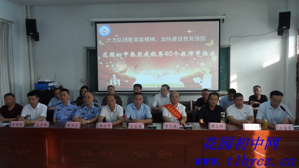 时维九月,硕果盈枝。9月10日,郊区花园初中在综合楼四楼大会议室隆重举行庆祝第40个教师节暨表彰大会。陈瑶湖镇人大主席吴岳斌,镇党委副书记詹社平,镇党委副书记、派出所所长戴世念,派出所教导员孟学锋,陈瑶湖镇领导周立彬,区教育局机关党支部书记余国胜,校长朱红春等校领导与家委会主任钱万利、退休教师代表、全体教师一起参加了会议。副书记汪海军主持了会议。